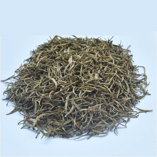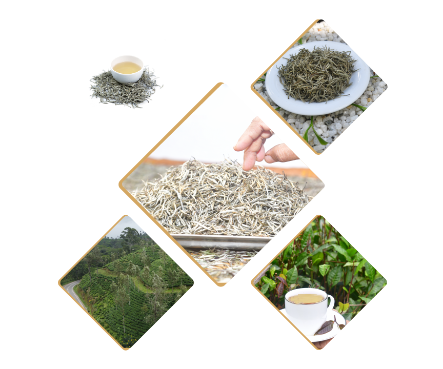 Golden Tips tea is a premium white tea that is similar to Silver Needles tea. It is made from the buds of the rare TRI 2043 cultivar of the Camelia Sinensis tea bush. The buds are handpicked, dried under diffused sunlight, and misted with golden brews.